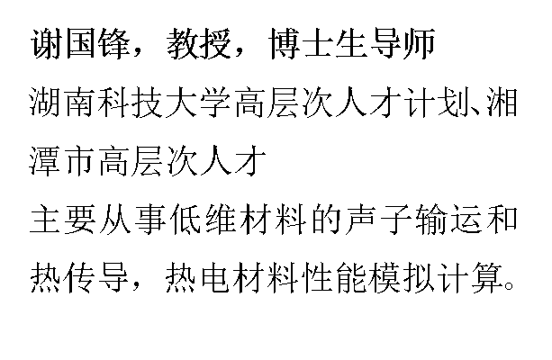 周五星,教授/博士生导师,湖南省青年科技创新人才,现任湖南科技大学材料科学与工程学院副院长。主要从事半导体材料和能源材料中的电子输运、热输运以及热电转换性质研究,主持国家自然科学基金3项(青年项目1项,面上项目2项)、湖南省“荷尖”人才项目1项,在国际知名期刊发表SCI论文100余篇,引用3000多次,入选2024年度、2025年度全球前2%顶尖科学家榜单。 |