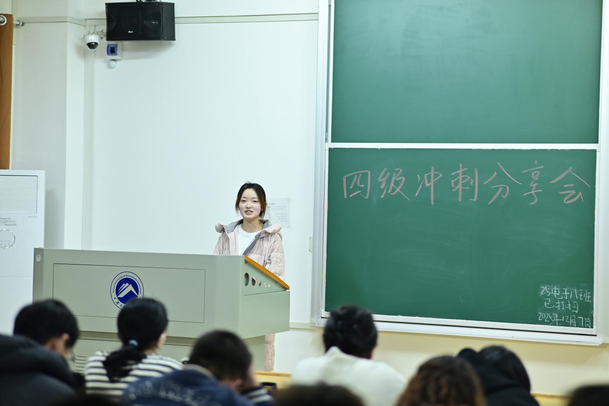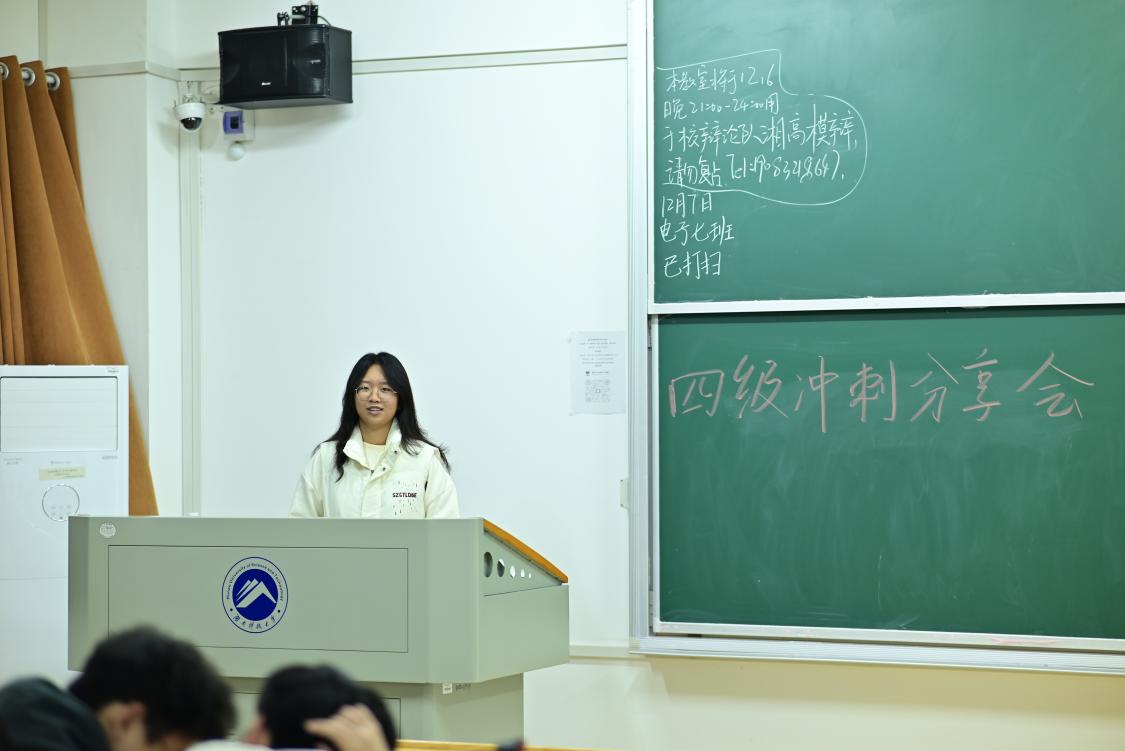 为赋能2024级学子高效备考,有效突破英语考级难点,12月7日晚,我院面向2024级全体学生,在知行楼各教室分专业举办了英语四六级考级经验分享会。优秀学生代表吕佳慧、王焕结合自身备考经验,就冲刺阶段备考进行主题分享。